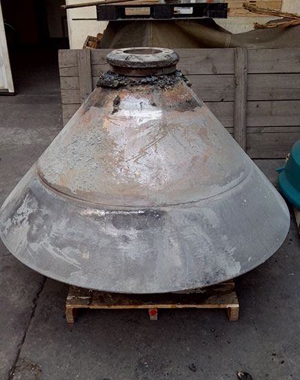 2014-06-10 客戶HP500 破碎機(jī)動錐體在更換襯板時發(fā)現(xiàn)鎖緊螺栓不能拆卸,運(yùn)到我公司維修。由我司技術(shù)人員判定為動錐體內(nèi)螺紋損壞,同時檢查動錐體外錐面,發(fā)現(xiàn)磨損嚴(yán)重。